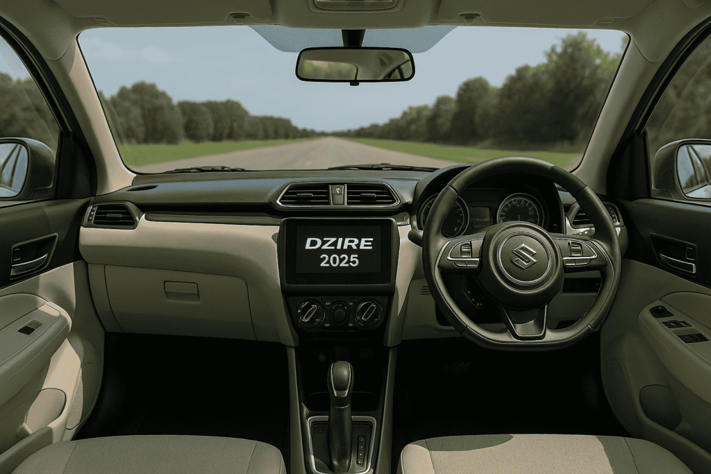 Maruti Suzuki Dzire 2025 का cabin और भी premium feel देता है। Dual-tone dashboard, नए infotainment system और spacious rear seats इसे फैमिली के लिए आरामदायक बनाते हैं।